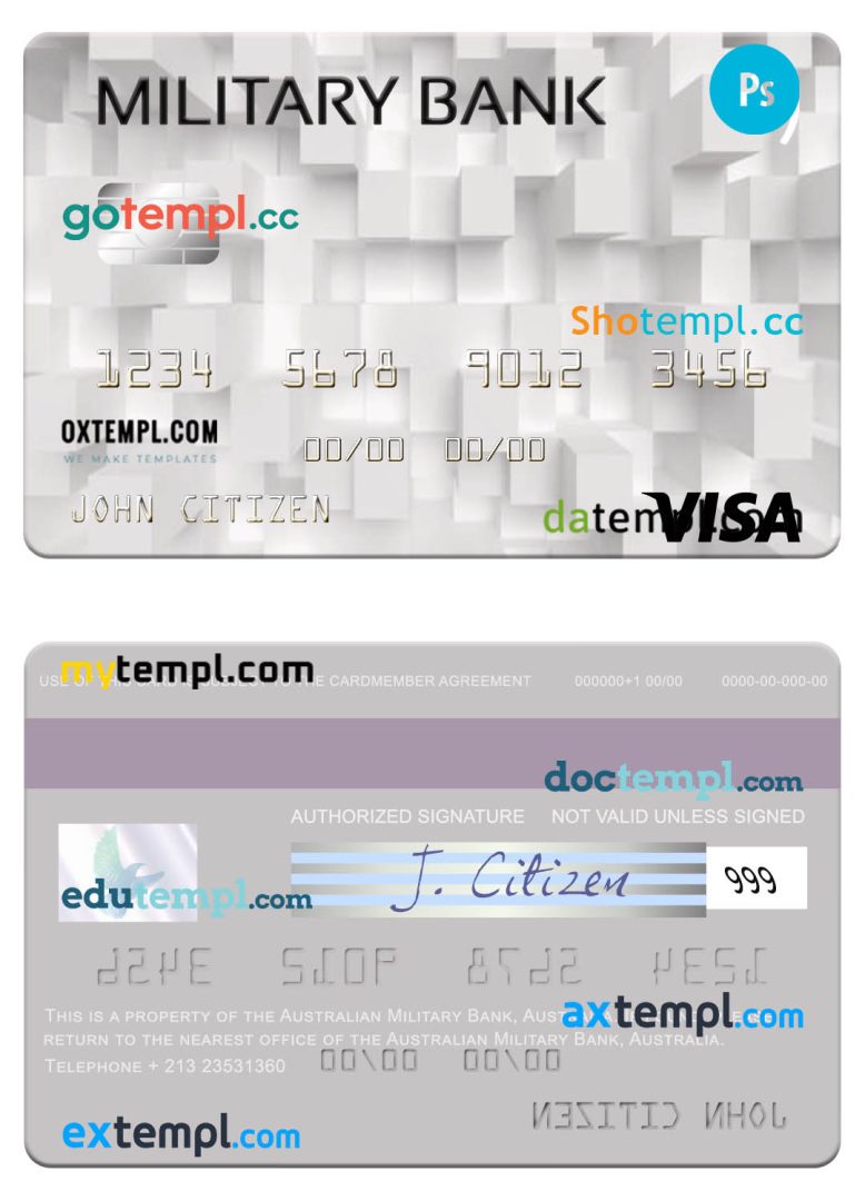 Completely editable Australian Australiann Military Bank visa card example in PSD format.