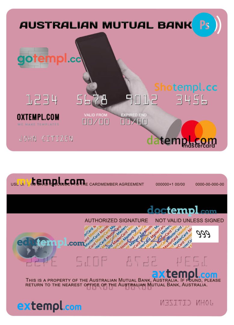 Completely editable Australian Australiann Mutual Bank mastercard example in PSD format.