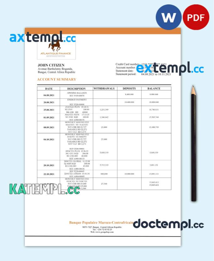 sample Central African Republic Banque Populaire Maroco Centrafricaine bank statement template in Word and PDF format download