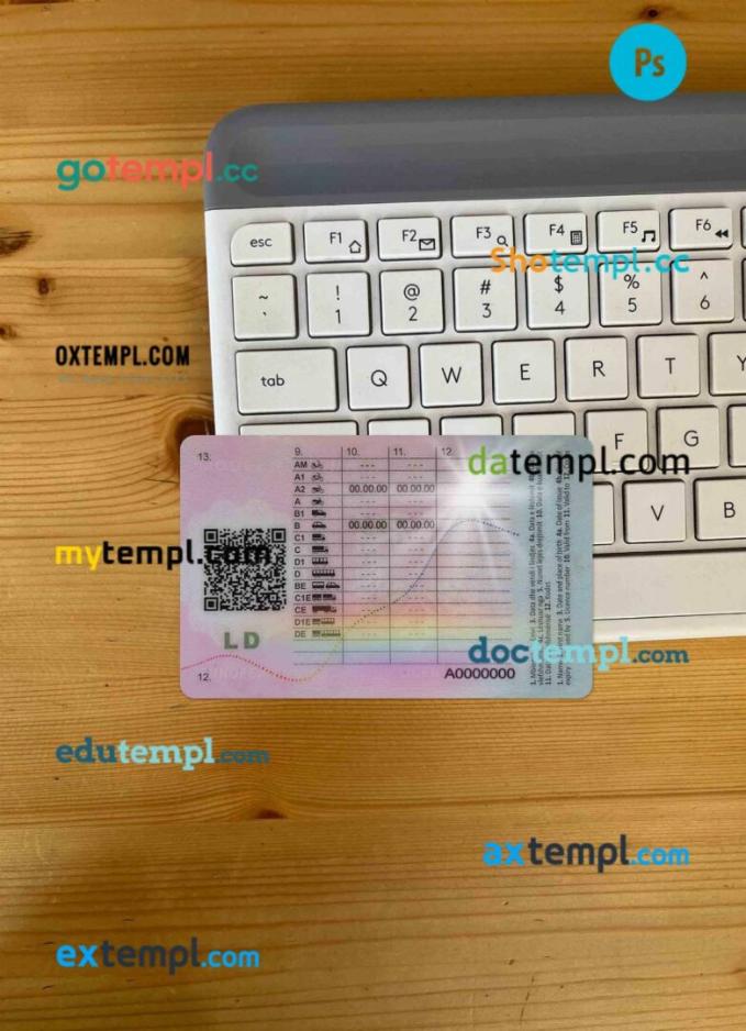 Our Albanian driver’s license template offers two options in one package: editable PSD files for both photo and scan looks.