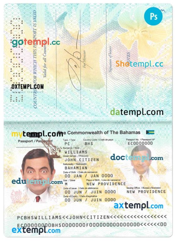 Bahamas passport template two in one with editable PSD photo look. This template is fully customizable and compatible with Adobe Photoshop.