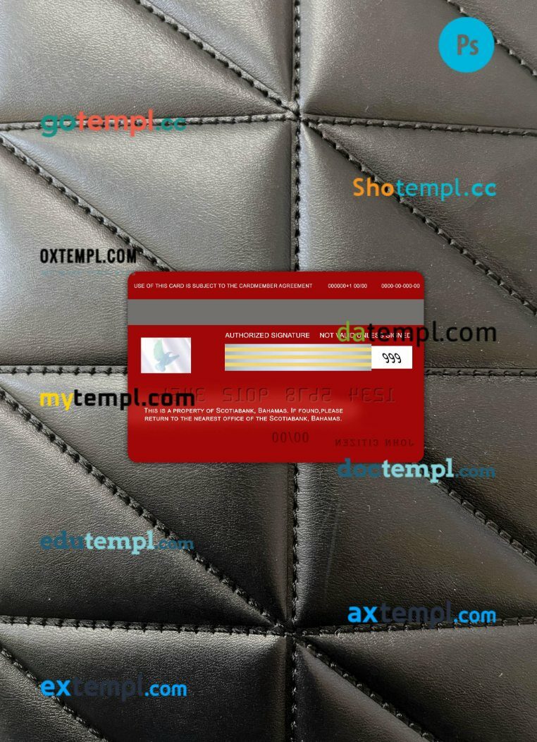 Our Bahamas Scotia bank visa card PSD template provides a multi-functional solution with a clean design, providing both the front and back of the card for a realistic look.