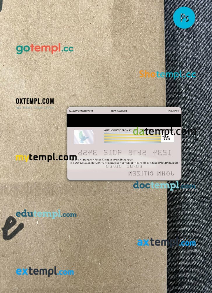 Our Barbados First Citizens bank visa card PSD template provides a multi-functional solution with a clean design, providing both the front and back of the card for a realistic look.