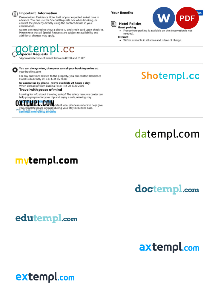 Burkinabé hotel booking confirmation Word and PDF example, 2 pages