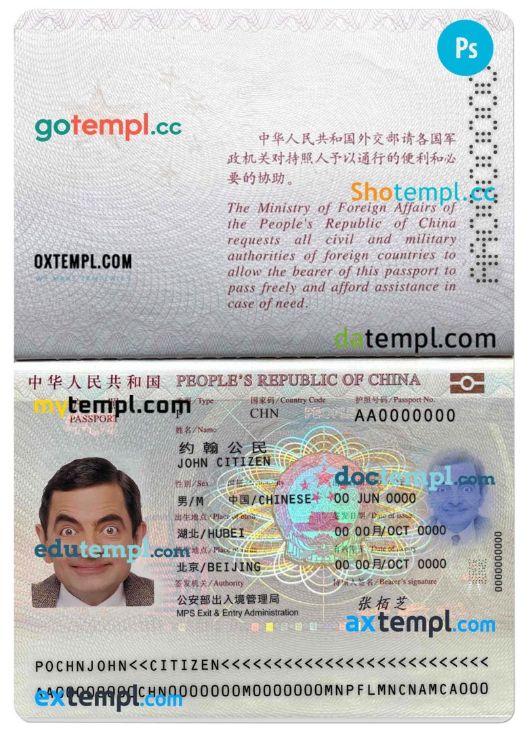 China passport template two in one with editable PSD photo look. This template is fully customizable and compatible with Adobe Photoshop.