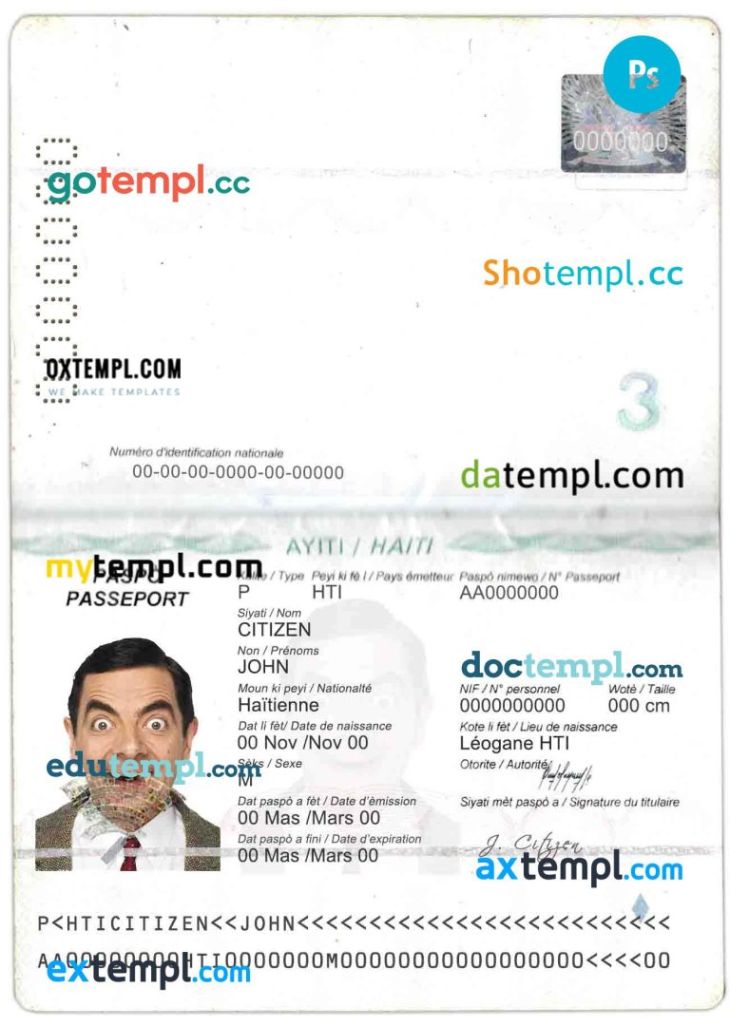 Haiti passport template two in one with editable PSD photo look. This template is fully customizable and compatible with Adobe Photoshop.