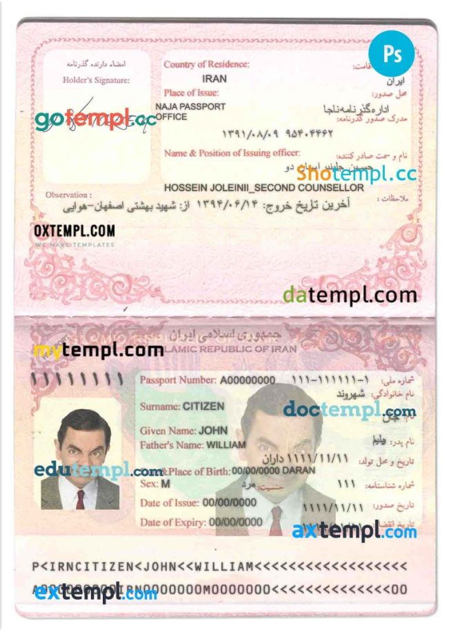 Iran passport template two in one with editable PSD photo look. This template is fully customizable and compatible with Adobe Photoshop.