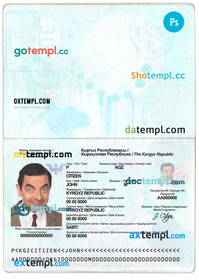 Kyrgyzstan passport Photoshop template two in one with photo look and scan PSD files, which has a clean design and multi-functional solution.