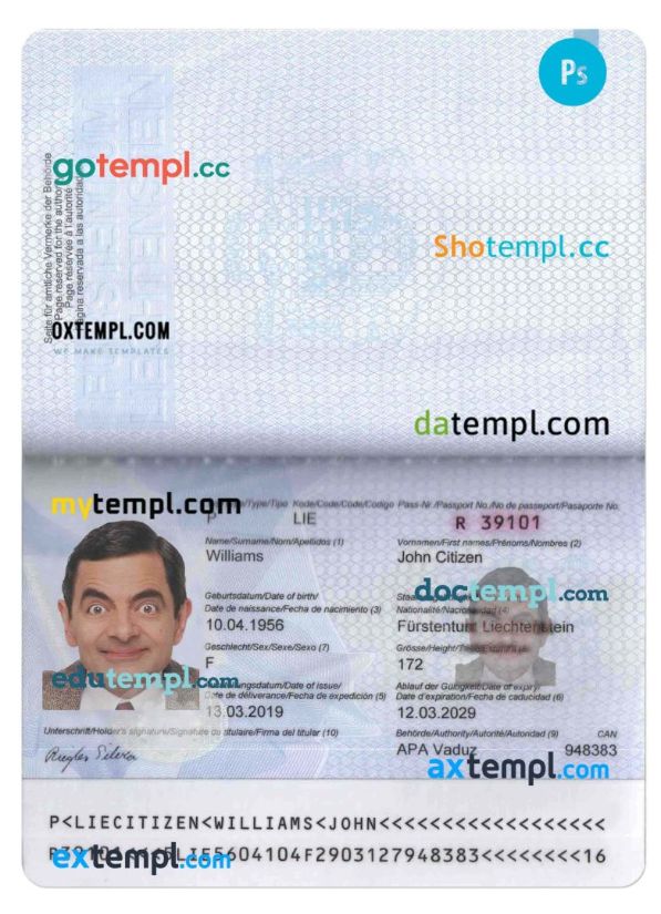 Liechtenstein passport Photoshop template two in one with photo look and scan PSD files, which has a clean design and multi-functional solution.