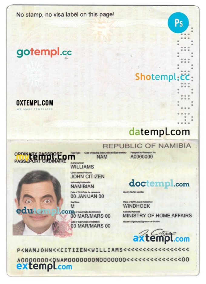 Namibia passport template two in one with editable PSD photo look. This template is fully customizable and compatible with Adobe Photoshop.