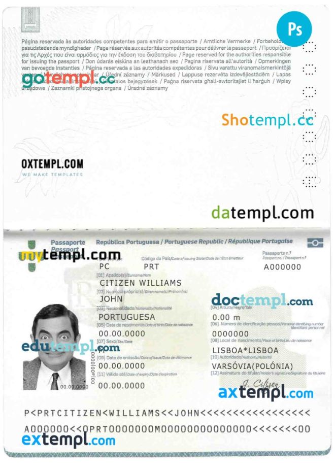 Portugal passport Photoshop template two in one with photo look and scan PSD files, which has a clean design and multi-functional solution.