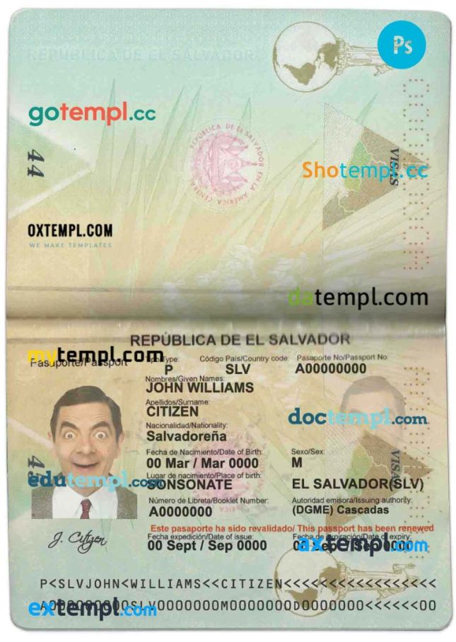 Salvador passport template two in one with editable PSD photo look. This template is fully customizable and compatible with Adobe Photoshop.