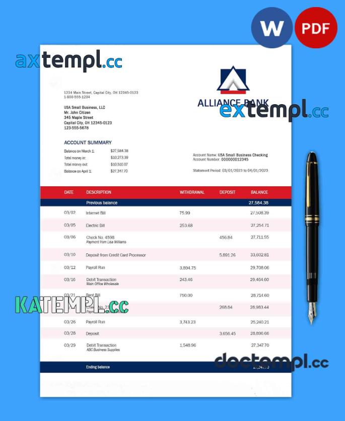 sample Alliance Bank enterprise account statement Word and PDF template download