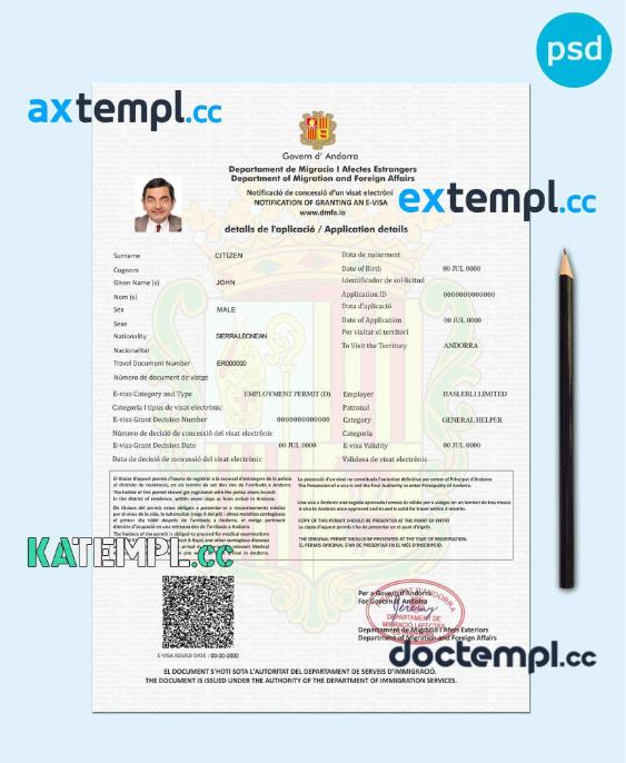 sample Andorra e-visa PSD template, completely editable, with fonts download