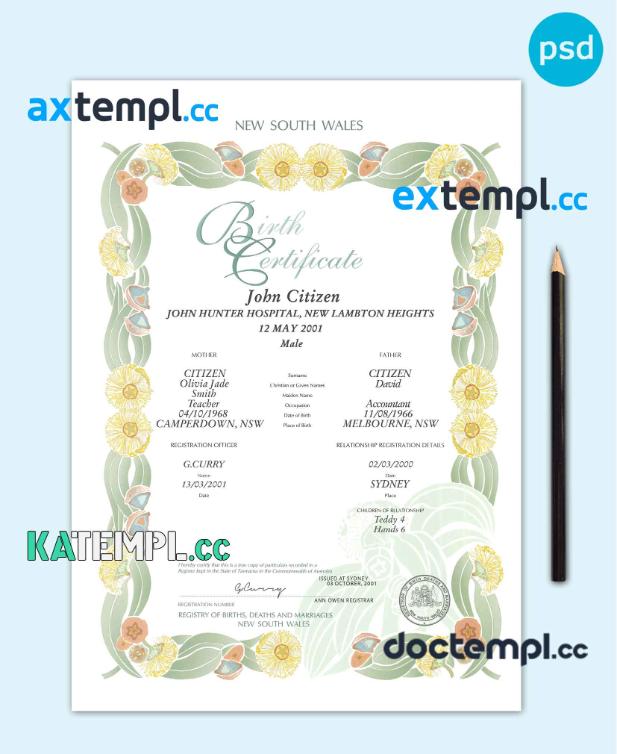 sample Australia New South Wales decorative (commemorative) birth certificate template in PSD format, fully editable download