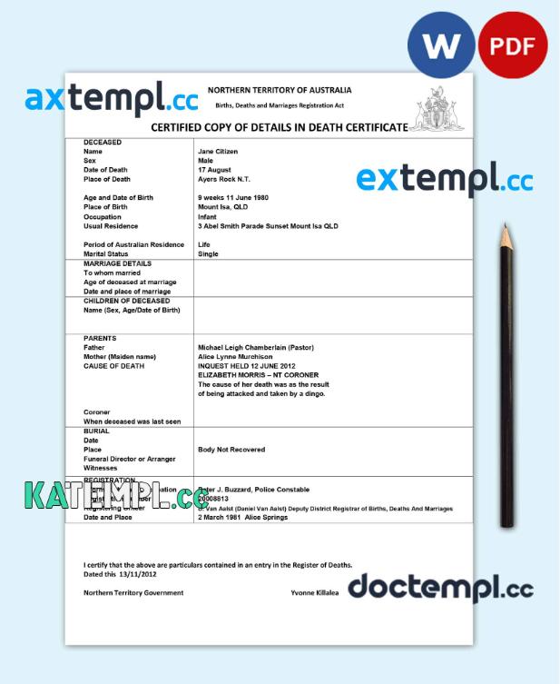 sample Australia Northern Territory of Australia death certificate template in Word and PDF format download
