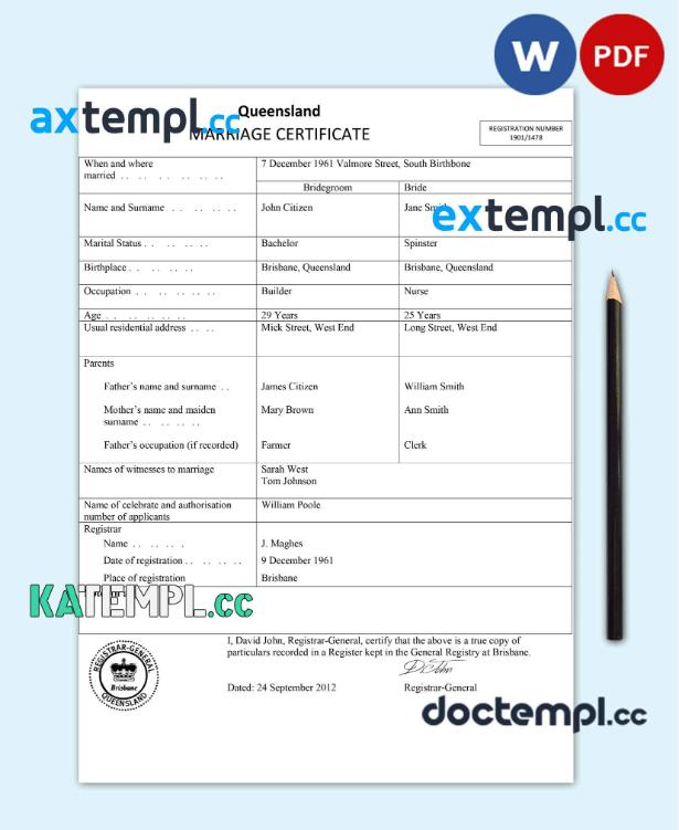sample Australia Queensland marriage certificate template in Word and PDF format download