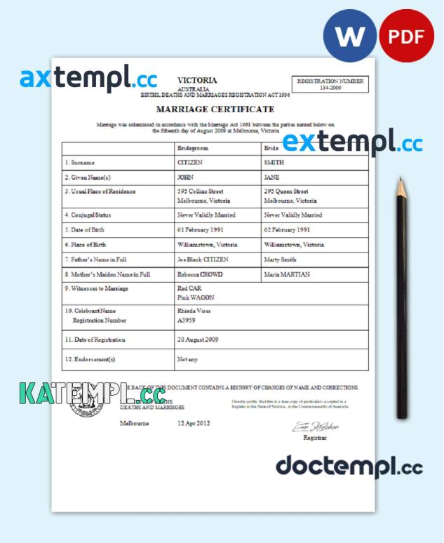 sample Australia Victoria marriage certificate template in Word and PDF format download