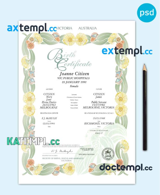 sample Australia Victoria state decorative (commemorative) birth certificate template in PSD format, fully editable download