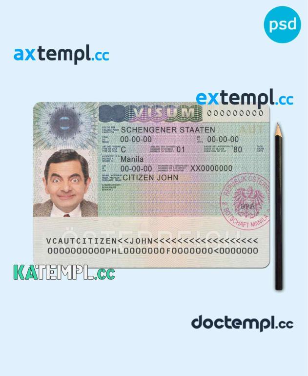 sample Austria schengen visa PSD template, fully editable download