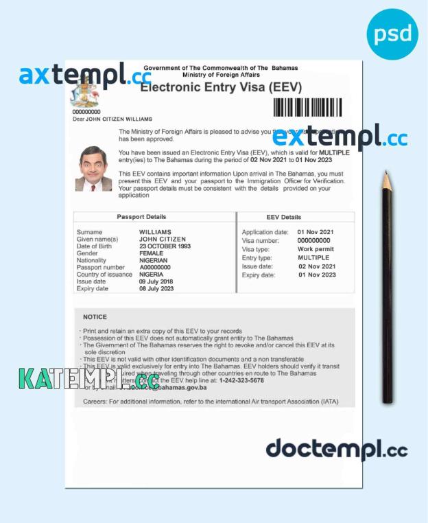sample Bahamas Electronic Entry Visa (EEV) PSD template, with fonts download