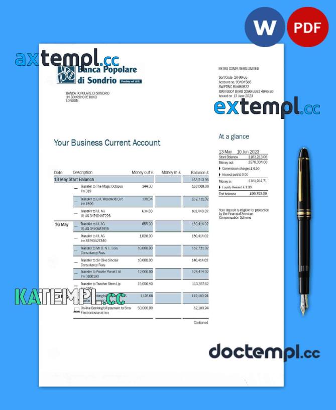 sample Banca Populaire di Sondrio Business Bank statement Word and PDF template download