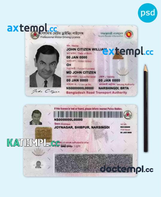 sample Bangladesh driving license template in PSD format, completely editable, version 1 download
