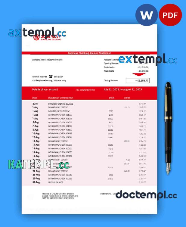 sample BANK of Beijing firm statement Word and PDF template download