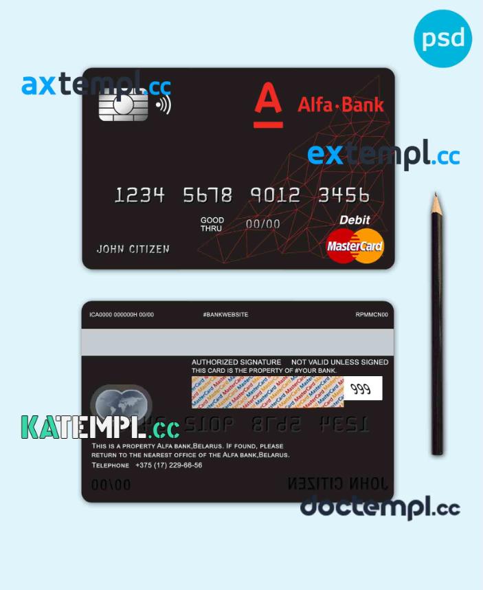 sample Belarus Alfa bank mastercard debit card template in PSD format, fully editable download