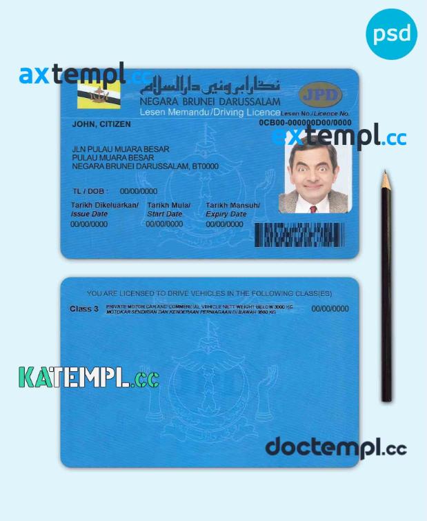 sample Brunei driving license PSD template, with fonts download