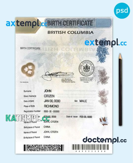 sample Canada British Columbia Birth Certificate template in PSD format download