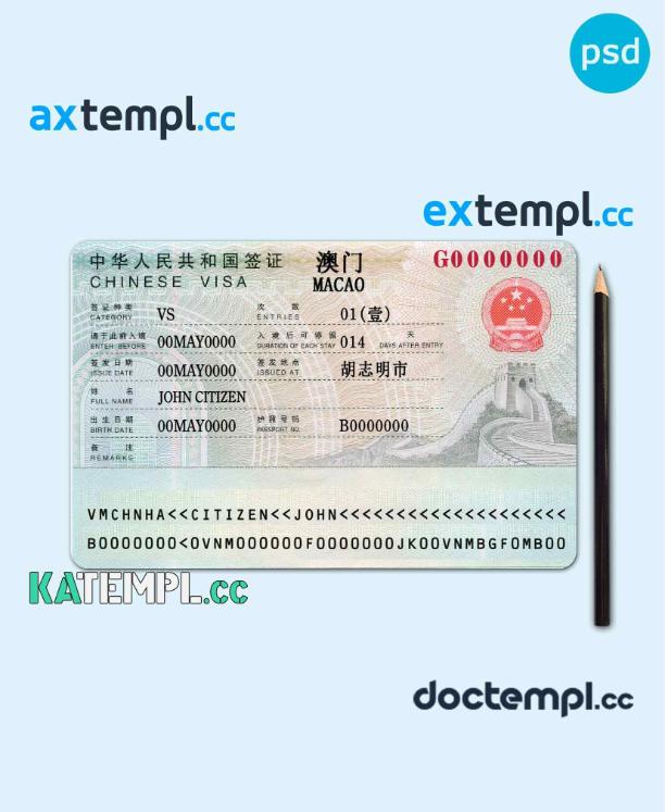 sample China (Macao) travel visa PSD template, with fonts download