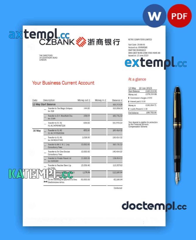 sample CHINA Zheshang Bank business bank statement Word and PDF template download