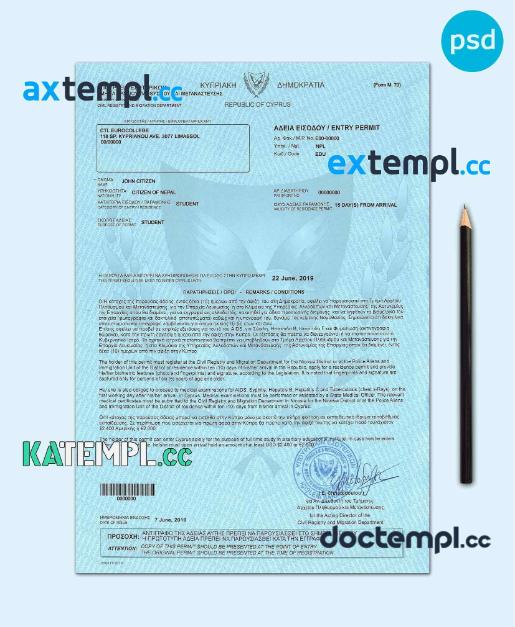 sample Cyprus student visa PSD template, with fonts download