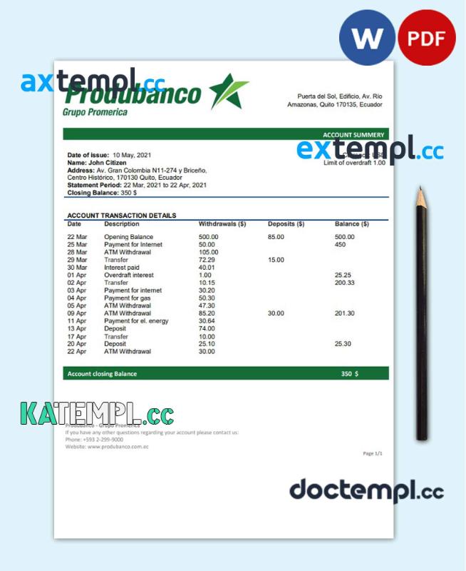 sample Ecuador Produbanco proof of address bank statement template in Word and PDF format download
