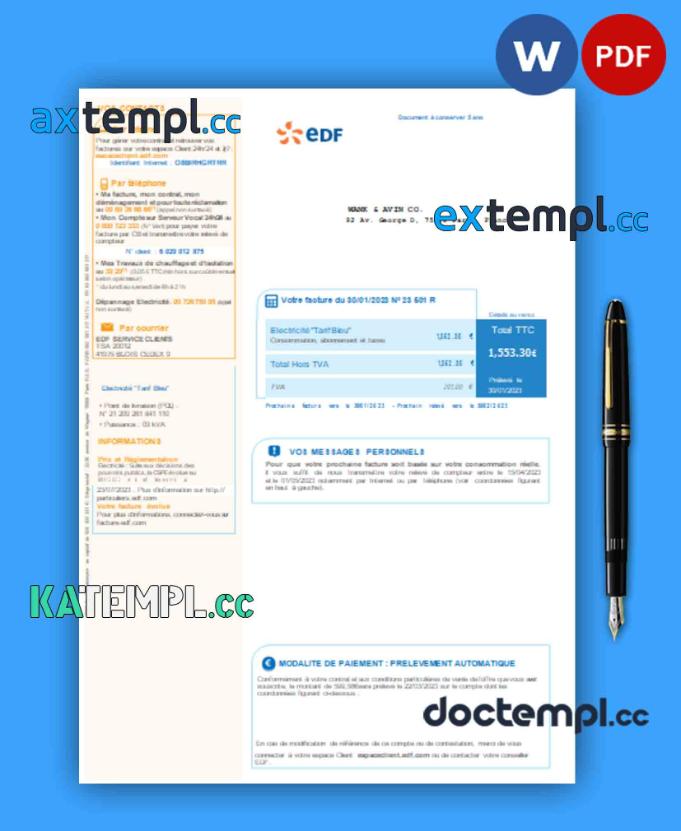 sample EDF France Electricity business utility bill,PDF and WORD template download
