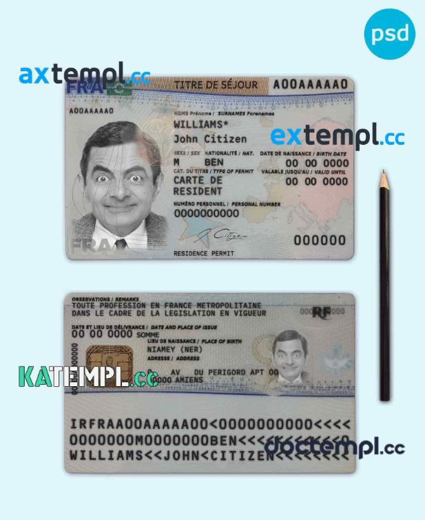 sample France residence permit (titre de séjour) template in PSD format, fully editable, with all fonts (2019 – present) download
