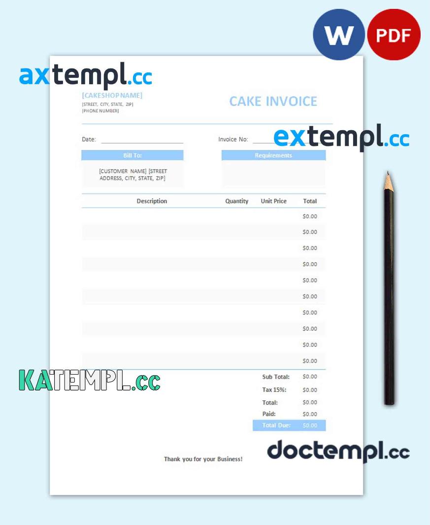 sample Free Cake Invoice template in word and pdf format download