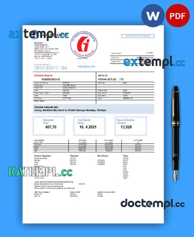 sample Gediz Elektrik business utility bill, Word and PDF template download