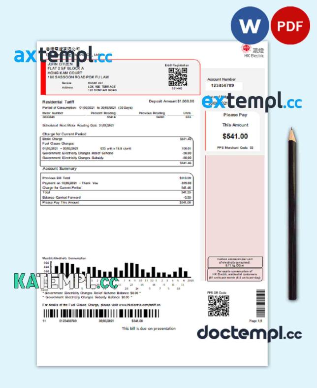 sample Hong Kong Hongkong Electric Company utility bill template in Word and PDF format download