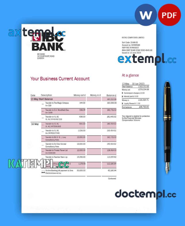 sample IBC Bank business checking account statement Word and PDF template download