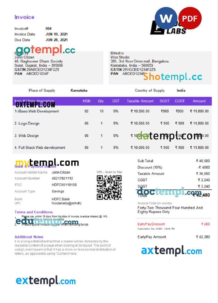 sample India Foobar Labs Information Technology Company invoice template in Word and PDF format, fully editable, version 2 download