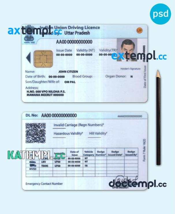sample India Union driving license template in PSD format, fully editable download