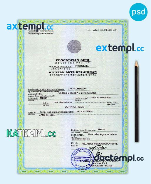 sample Indonesia birth certificate template in PSD format, fully editable download
