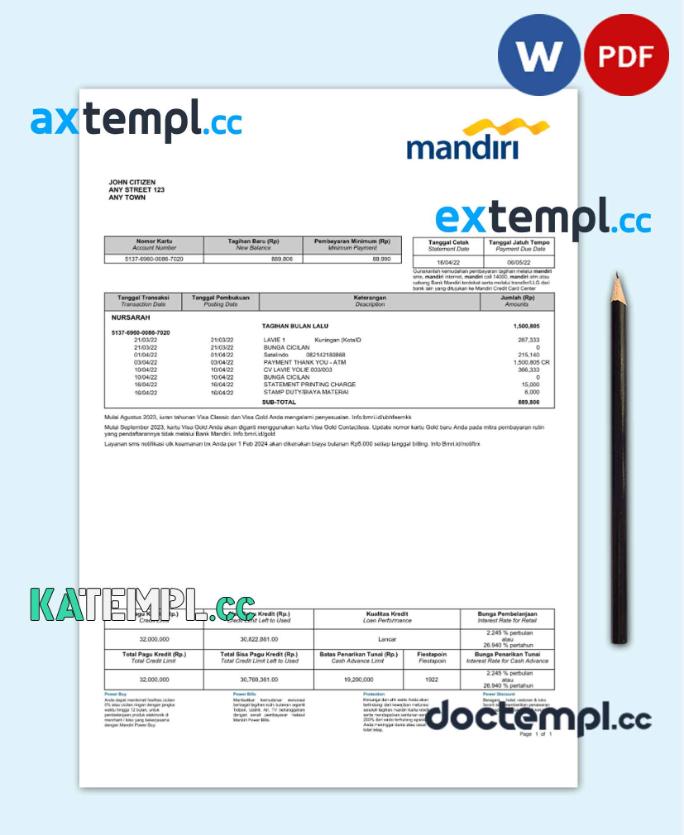 sample Indonesia Mandiri bank statement Word and PDF template download