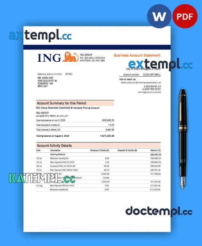 sample ING Groep bank company account statement Word and PDF template download