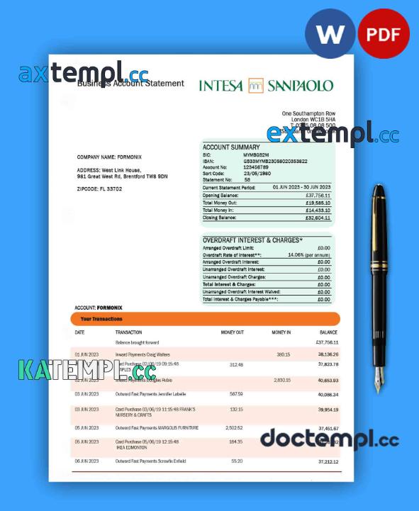 sample INTESA Sanpaolo Bank enterprise account statement Word and PDF template download