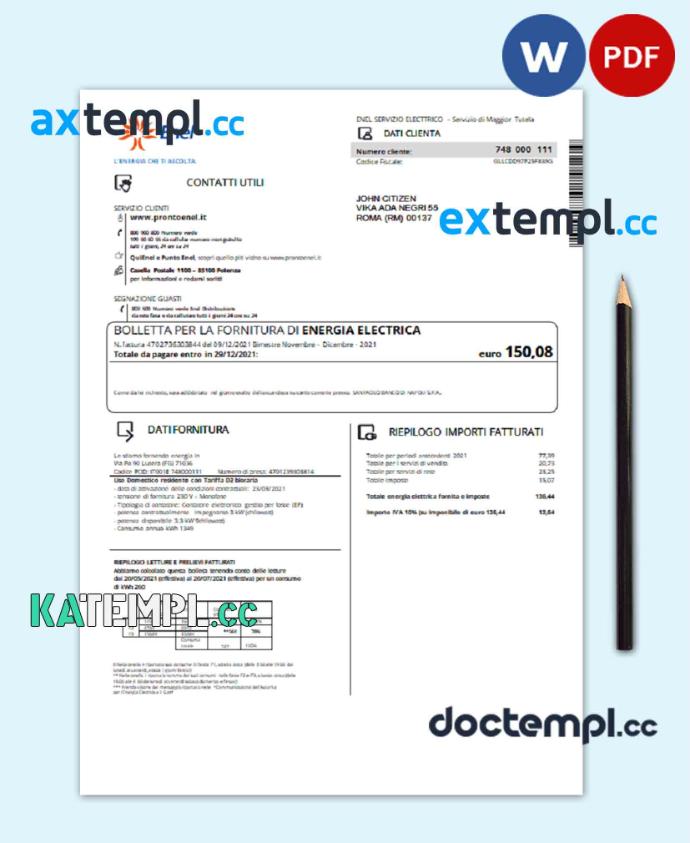 sample Italy Enel electricity utility bill template in Word and PDF format download