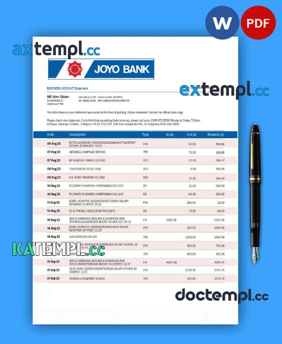sample Joyo Bank company checking account statement Word and PDF template download