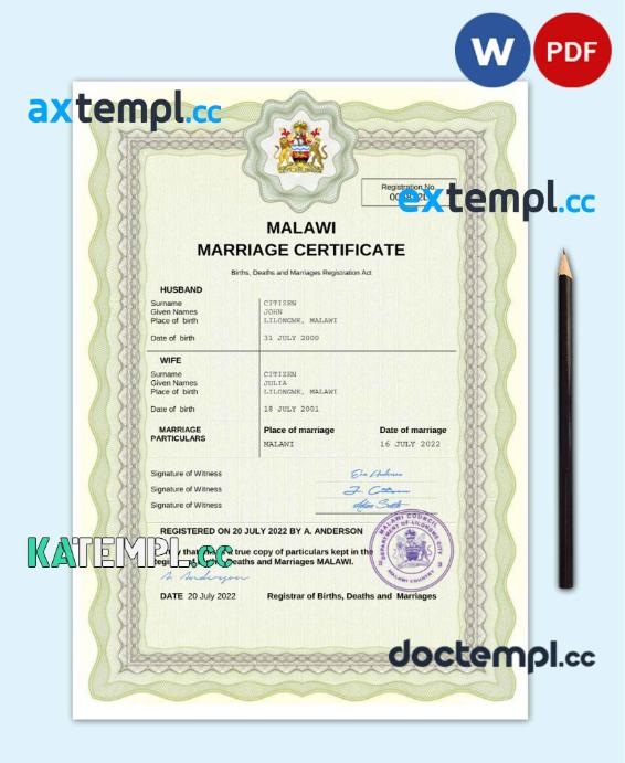 sample Malawi marriage certificate Word and PDF template, completely editable download